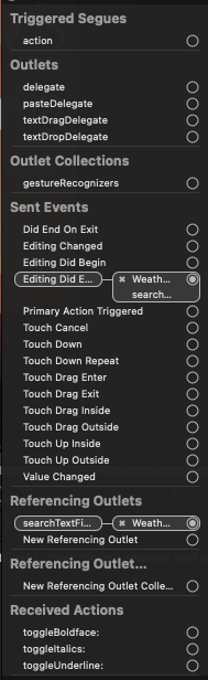 2023-06-02 14:56:27.902501+0900 Clima[14882:416323] -[Clima.WeatherViewController searchTextFiled:]: unrecognized selector sent to instance 0x131707320