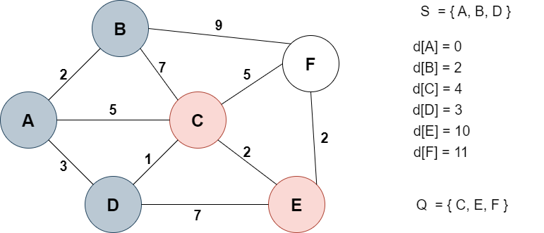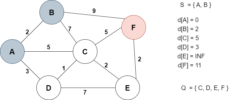 B에서 방문 가능한 F 거리 없데이트 C 의 거리를 업데이트 하려고 보니 2 + 7 (A를 거쳐 B에서 C )은 5 (A에서 C) 보다 값이 큼으로 업데이트 하지 않습니다 최소 거리의 값이 중요하기때문입니다.