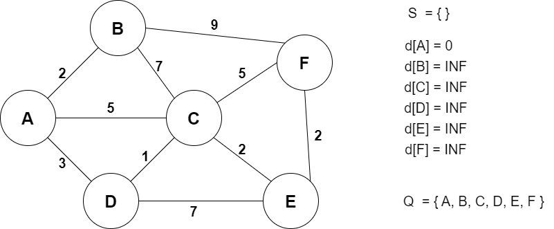 목표는 A 노드에서 F노드로의 최단 경로를 구하는 문제입니다.