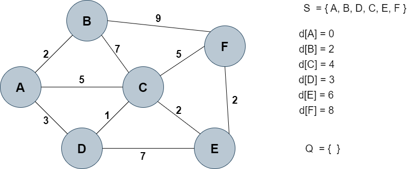 목적지가 F 임으로 A->D->C->E->F 가 최단 경로로 8 입니다